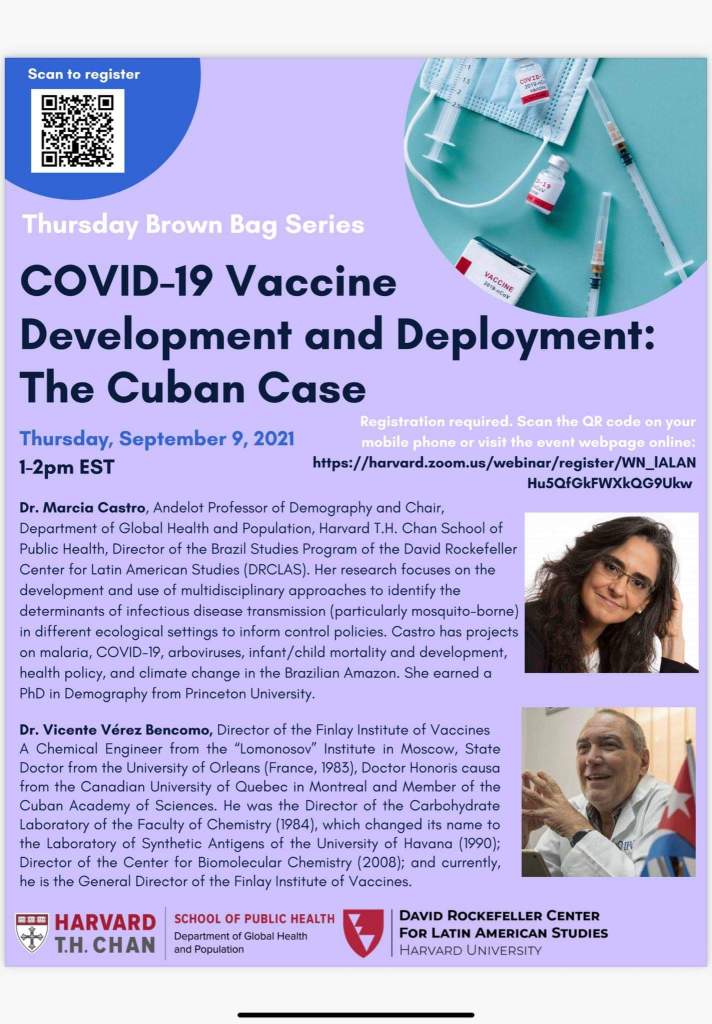 See the informative webinar from September, “COVID-19 Vaccine Development and Deployment: The Cuban Case” from the Harvard David Rockefeller Center for Latin American Studies, Mexico Office featuring Dr. Vicente Vérez Bencomo, Director of the Finlay Institute of Vaccines and Marcia Castro, Chair, Department of Global Health and Population, Harvard T.H. Chan School of Public Health recorded here.