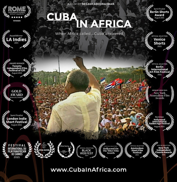 See the international webinar premiere of award-winning short film Cuba in Africa on Zoom with with producer and director Negash Abdurahman and panelists: Ambassador Lianys Torres Rivera, Cuba’s Ambassador to the United States, Isaac Saney, from the Canadian Network on Cuba, Piero Gleijeses, Professor of American Foreign Policy at Johns Hopkins University.