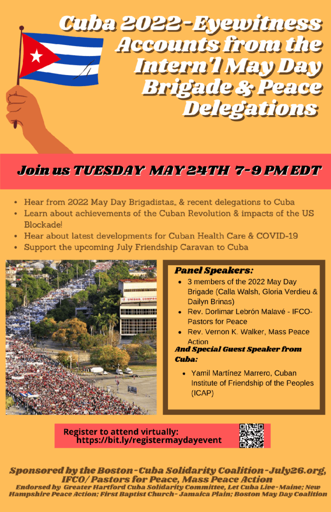 COVID-19 IFCO/Pastors for Peace Virtual Event: Cuba 2022 — Eyewitness Accounts from International May Day Brigade & Other Delegations By Wisconsin Coalition to Normalize Relations with Cuba on May 13, 2022 • ( Leave a comment ) Tuesday, May 24th 7-9 PM EDT (6-8 CDT) Register Share this: Click to share on Facebook (Opens in new window) Facebook Click to share on X (Opens in new window) X Like Loading... Related Categories: COVID-19, Embargo, Events, Healthcare, Travel Tagged as: Cuba, Cuban Embargo, Healthcare, IFCO, May Day, Pastors for Peace, Travel to Cuba