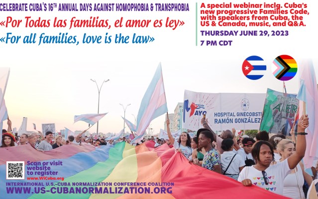 Celebrate Cuba’s 16th Annual Days Against Homophobia and Transphobia — “Por Todas las Familias, el Amor es Ley” / “For all Families, Love is the Law”, organized by the US-Cuba Normalization Conference Coalition.
